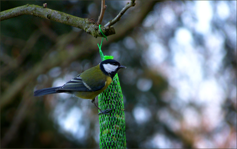 Heute morgen habe ich wieder Futter an einen Zweig gehängt