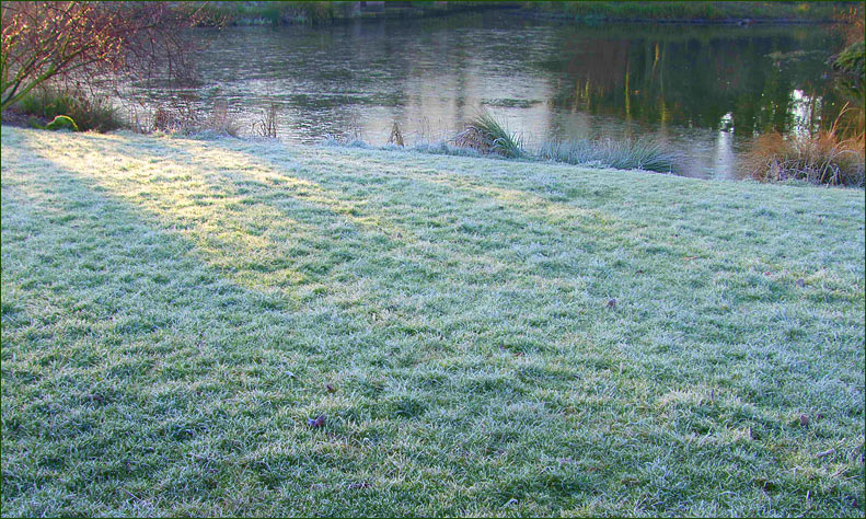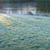Reif auf dem Gras und der Teich war zur Hälfte von der Nachtkälte gefroren