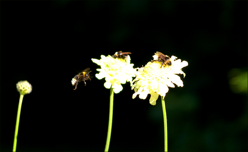 Drei Hummeln, drei Blüten.