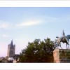 Das Foto zeigt links die Kirche St. Martin und die Häuser der Kölner Altstadt. Rechts von dem wilhelminischen Reiterstandbild ist noch ein kleiner Teil der Fassade des Museums Ludwig zu sehen.