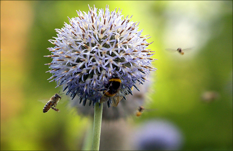 Stark die Aufnahme. Es macht schon Spaß nur zuzusehen, wie sich die Insekten an der Kugeldistel erfreuen. Manchmal glückt dann auch ein schönes Foto.