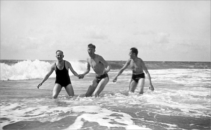 Die Welle kommt, sie halten sich fest, damit sie nicht mitgerissen werden. Die Bademode ist klasse. Damals trug man noch nicht so viel Haut.