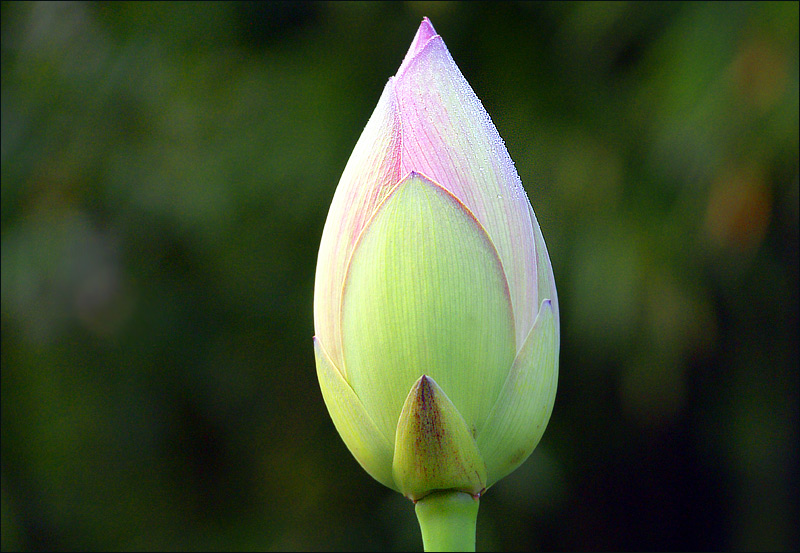 Ein Lichtstrahl fällt auf diese Knospe und lässt den Morgentau wie Diamanten auf den Blättern strahlen.
