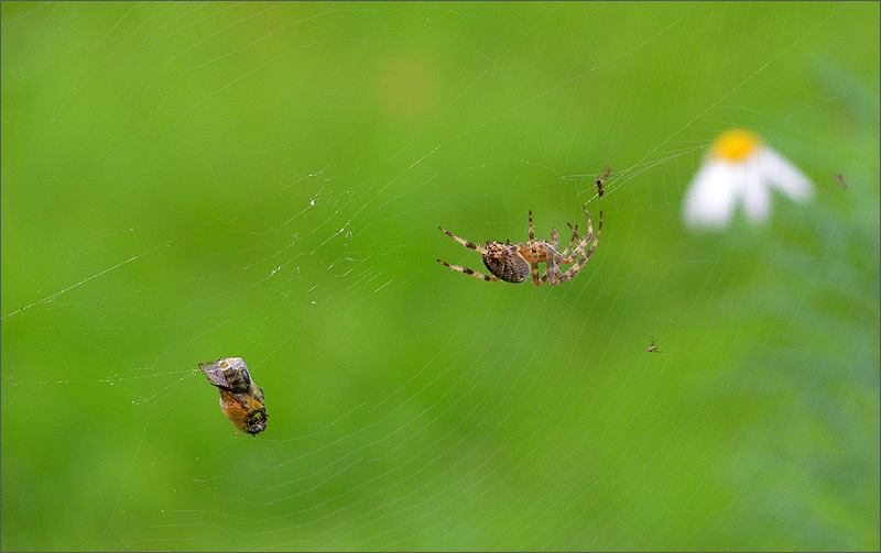 Wie lange so eine Spinne auf ihren Leckerbraten warten muss. Es sind ihr auch noch kleine ins Netz gegangen. Falls dieses eine Eintagsfliege ist, dann hat sie Glück gehabt. Tiere töten nur für ihre Nahrung im Gegensatz zu den Menschen.