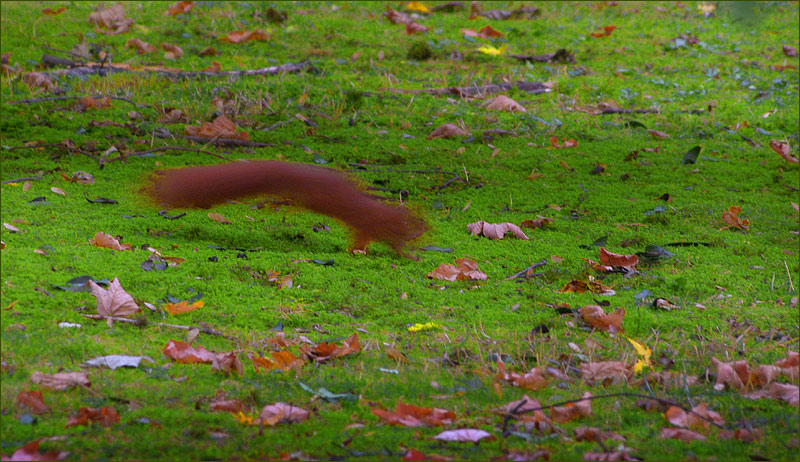 Ich saß im Bungalow, als ich draußen einen unbekannten und großen Krach hörte und dachte Einbrecher wollen sich mit mir treffen. Als ich hinaustrat, erkannte ich dann nach genauerem Hinschauen, daß sich zwei Eichhhörnchen jagten. Es dauerte nicht lange und alles begann sich zu drehen und zu tanzen - die Bäume, mein Kopf... Ich habe die Tierchen kaum gesehen - es ging alles so rasend schnell, immer im Kreis von Baum zu Baum... Das Tempo, daß sie erreichen können, aber wahrscheinlich noch mehr an den Bäumen als am Boden, ist unglaublich hoch.