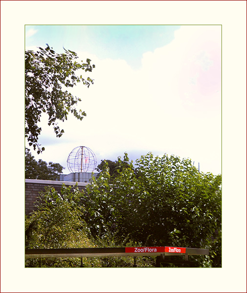 Diese Skulptur des Kölner Künstlers HA Schult steht auf einem Flachdach. Gesehen und fotografiert vom Seiteneingang zum Kölner Zoo an der Haltestelle zur Kölner Flora.
