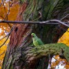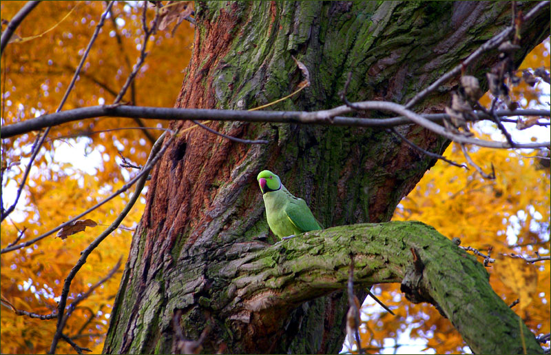 Baum und Halsbandsittich tragen ein grünes Kleid. Ein schönes Bild.