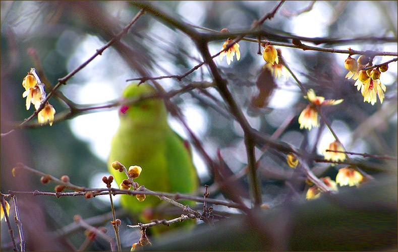 Ich wollte ja eigentlich den Papagei fotografieren - aber mit den Blüten im Vordergrund ist es nun auch schön