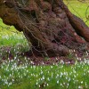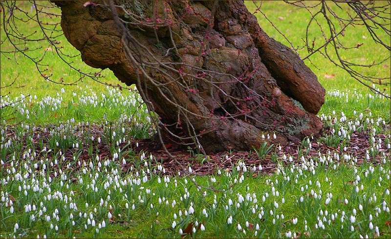 Der starke gekrümmte Baum umrandet mit den zarten Schneeglöcken, ein wunderbarer Anblick.