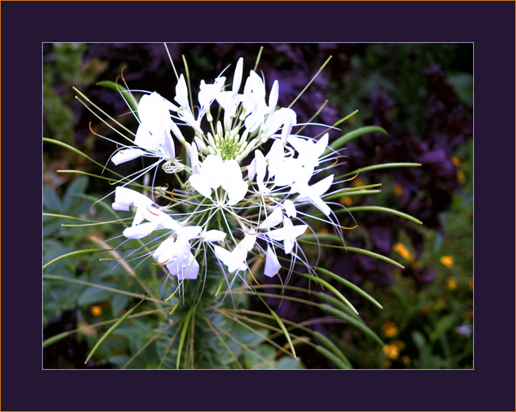 ich glaube (weiß es also nicht genau) sie heißt Spinnenpflanze und gehört zu den Springpflanzen, denn wenn man die Samenstände berührt, springen sie explosionsartig auf und versprühen ihre Samen.