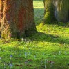 Ein schönes Foto von den starken Baumstämmen und den dagegen kleinen Krokussen.