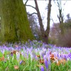 Wunderschöner Krokussteppich, schmücken Bäume und Wiese.