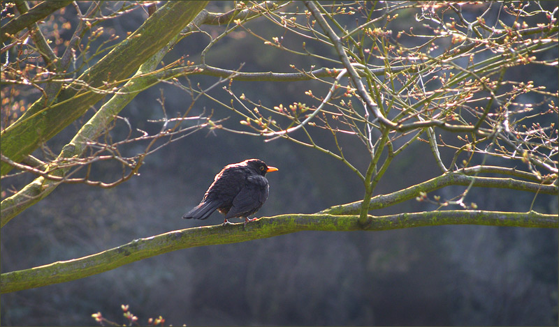 Eine schöne Amsel, und die Knospen an den Bäumen sind schon weit geöffnet.