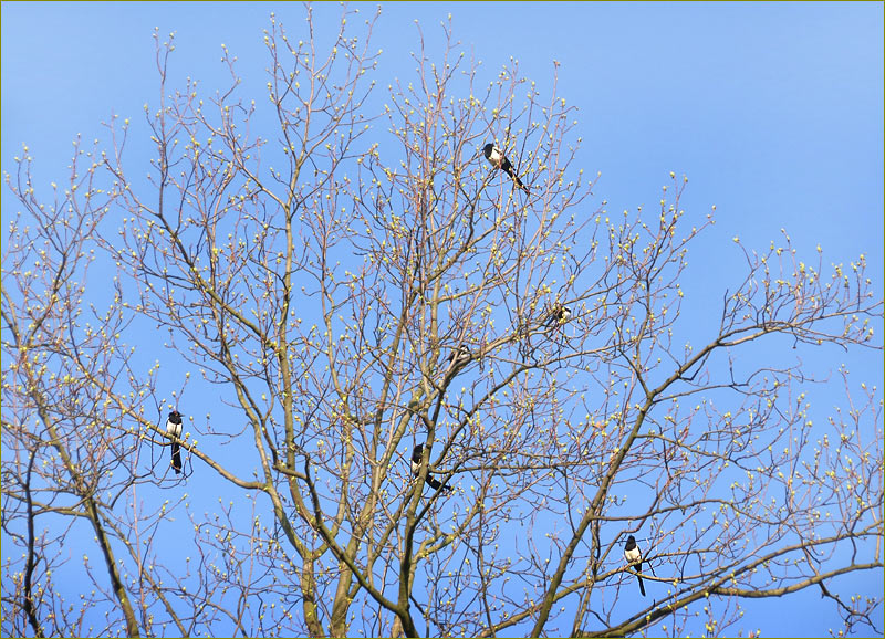 Glückwunsch zu diesem schönen Foto. Gleich sechs Elstern. Vorgestern sah ich auf unserer Wiese fünf Elstern und hatte keinen Fotoapparat dabei. Jetzt kann ich so viele auf einmal hier betrachten.