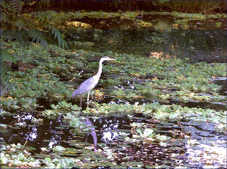 Wenn es so viele Seerosen gibt, muß der Fischreiher sicher darauf achten, beim Laufen nicht an den vielen Stielen unter Wasser hängen zu bleiben. Er steht in einem Bereich, wo es keine Blätter gibt.