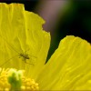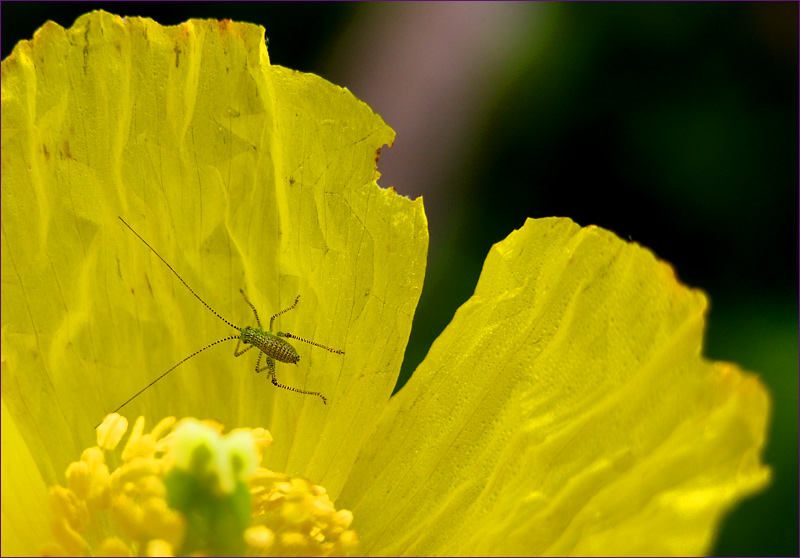 Das Insekt ist noch eine L a r v e, vielleicht von einer "Schrecke" z.B. Heupferd, die sich von zarten Blütenblätterteilen ernährt. (Siehe Fraßspuren am Blütenblätterrand)