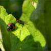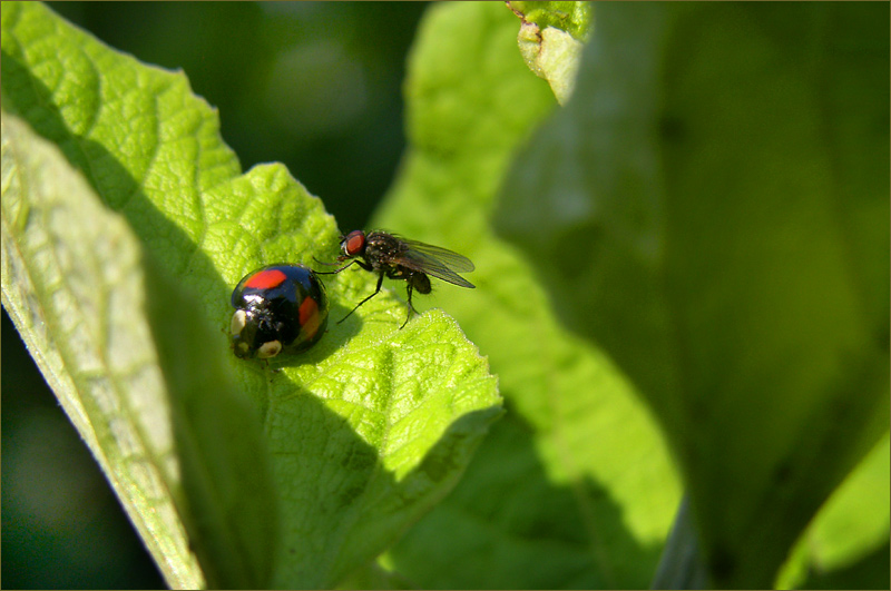 "Du böse Fliege, wenn ich dich kriege", denkt der Marienkäfer. Aber ich denke mal, die Fliege kann sich in den blanken Flügeln des Marienkäfers sehen. Super toller Schnappschuss.