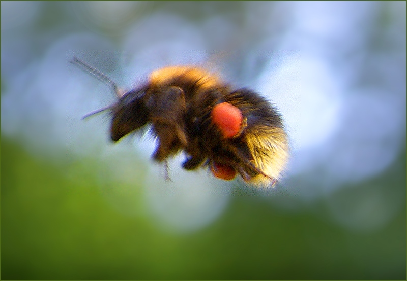 Beim Nektarsammeln fangen sich am Hummelpelz die Blütenstaubpollen. Wie die Honigbiene bürstet die Hummel diese mit den Beinen nach hinten und sammelt sie in den Körbchen der Hinterbeine. Dann fliegt die Hummel mit gelben "Höschen" dahin.