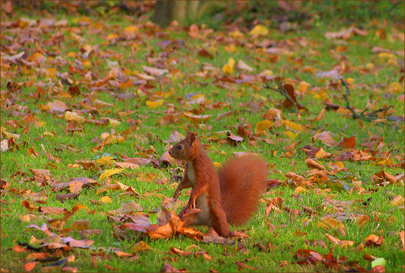 Ein staunendes Eichhörnchen, was im Herbst so passiert, es fühlt die Blätter