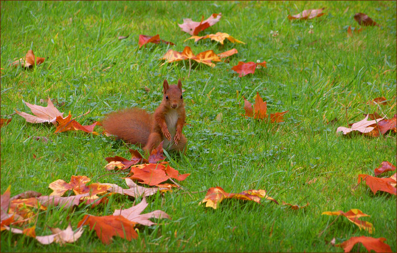 Wunderschöne Herbstblätter, natürlich das Eichhörnchen auch.