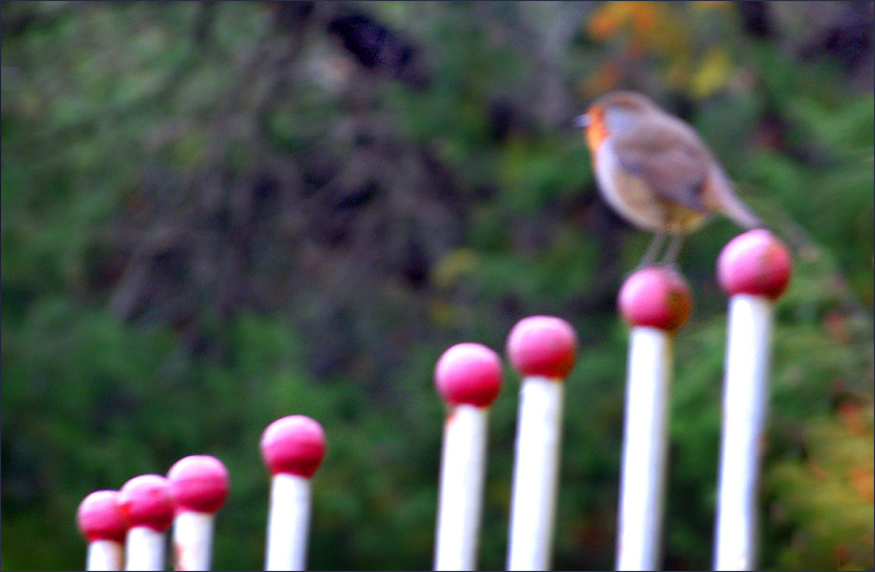 Das wäre so ein schönes Foto vom Rotkehlchen auf dem Zaun geworden, aber bei der Schärfeeinstellung habe ich mich leider vertan
