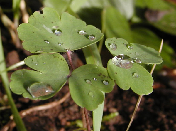 ... Solche gerundeten Tropfen auf einem Akelei-Blatt können einem neugierig Fragenden so manches erklären...von Oberflächenspannung des Wassers, die durch Spüli zerstört wird, aber den Wasserläufern das Laufen erlaubt