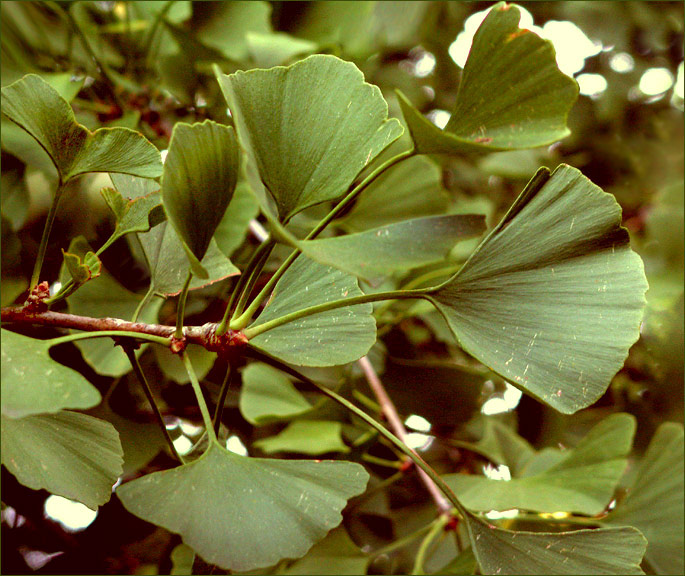"Gingko biloba" oder Fächerblattbaum/Elefantenohrbaum zählt zu der frühen Entwicklungsstufe, etwas der zwischen Palmenfarnen und Nadelbäumen.