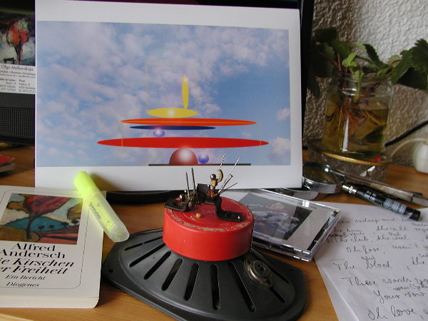 Entwurf von Markus, danke und ausgedruckt, Leonhard Cohen von espere, Kirschen der Freiheit für Peter, Magnetismus auf ausgebauten, kaputten Lausprecher für Ebberhard, Olga Malkovskaja für alle Künstler, Texte über Liebe für den Blog für robi, ingo und ???????.....Wurzel ziehende Erdbeerausläufer für Rainer,....und die Lupe für die Philosophen, damit sie die "Wahrheit" finden können...