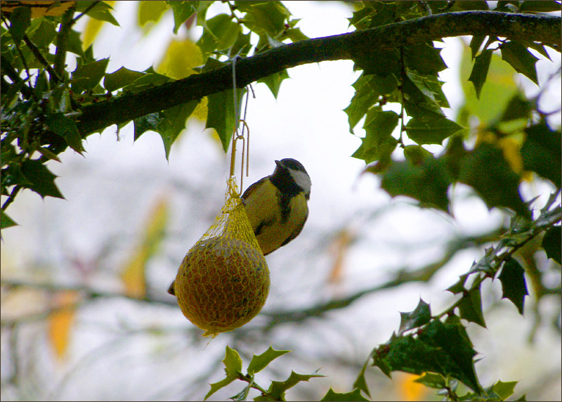 Ein Meisenknödel und dann noch gleich mit Meise, das macht das Bild wunderschön.