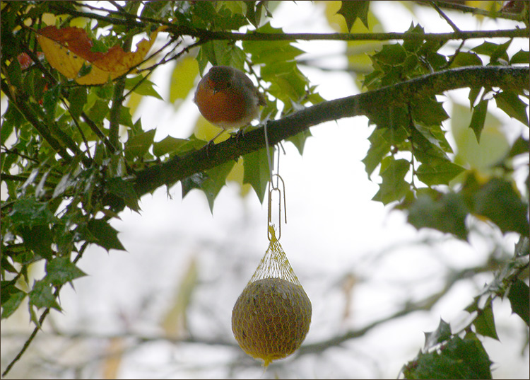 Es wunderte sich, warum da ein Meisenkolben hängt und kein Kolben für Rotkehlchen