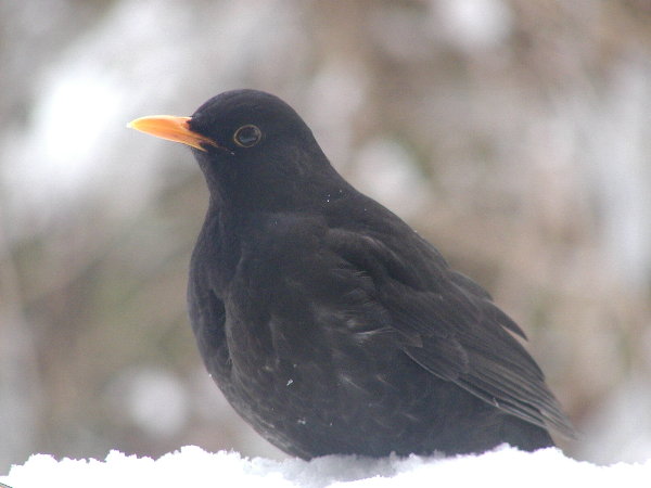 Die Amsel beobachtet ihren Futterplatz aus dem Gestrüpp und kommt immer wieder zum Naschen