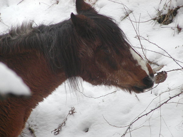 Er heißt Toro, der Stier, und war, wohlbemerkt war, fast genauso wild wie ein Stier. Er hat eine lange weiße Blaisse am Kopf, sodaß man schon genaus hinschauen muss, was ist Schnee und was Blaisse ist.