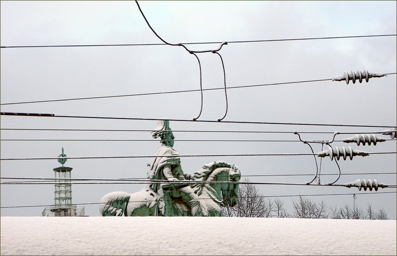 Mit den Stromoberleitungen der Bahn