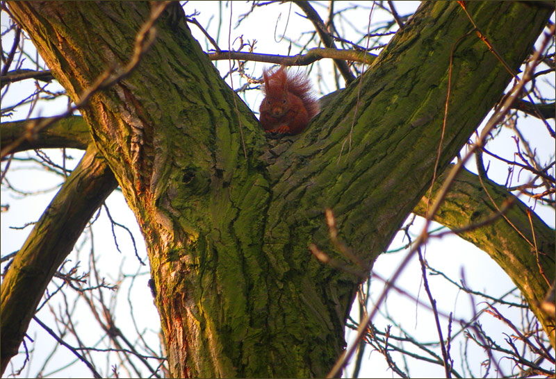 Schön, wie es zwischen den Baumarmen sitzt. Es beobachtet dich.