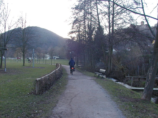 Dieser Bach und der Radweg fließt (führt) bis an den Rhein und endet dort in einem Naturschutzgebiet.