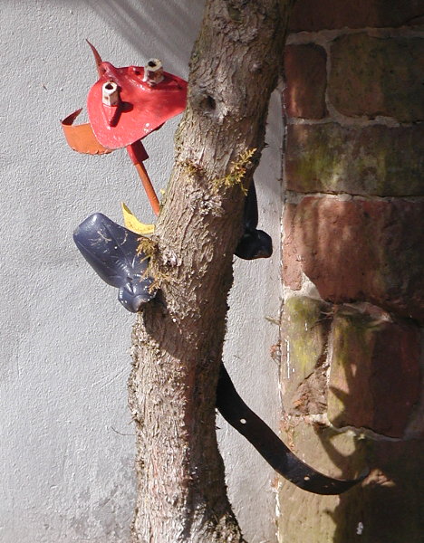 und ich habe es in diesem Frühling an den Lebensbaum an die Autoeinfahrt geklemmt, als Begrüßung der Gäste. Es bewacht die Spatzennester weiter oben.