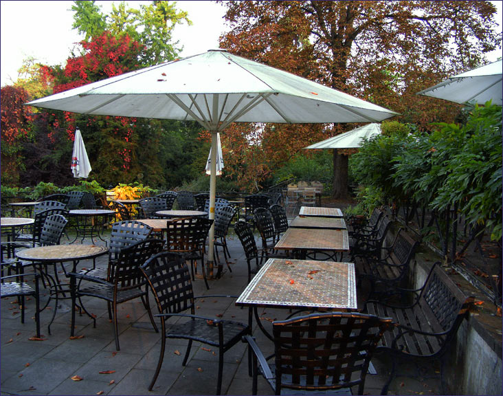 Ein Gartenterrassenrestaurant am frühen Morgen.