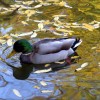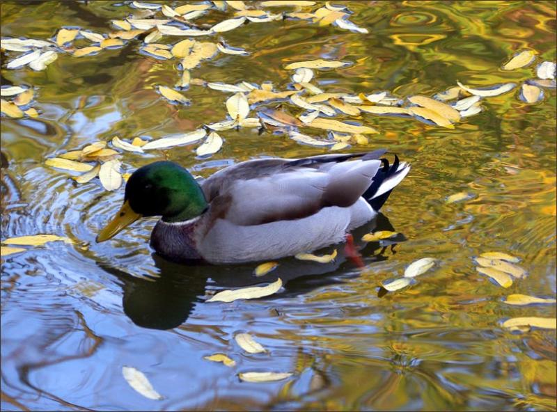 Dieses Bild erzählt von "ruhiger" Bewegung. Die Blätter schwimmen an der Stelle zu einer anderen Stelle. Aber weil es viele sind, merkt man kaum, wie sie die Positionen wechseln. Die Flügel der Ente schimmern merkwürdig hell. Das Wasser strudelt und schüttelt das Licht.