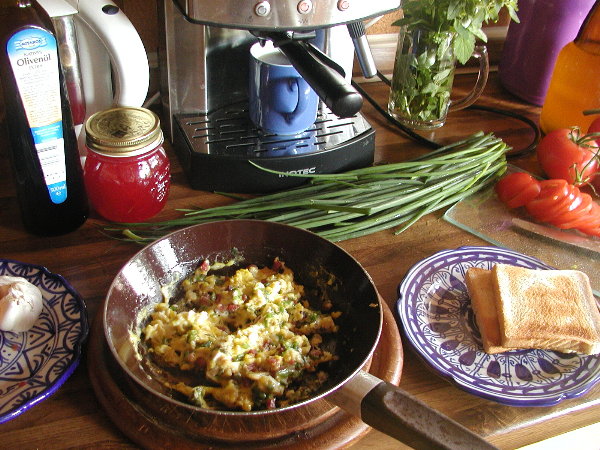 Nach einer Stunde Stall- und Gartenarbeit, manchmal auch Frühgymnastik, kommt schon der Hunger um diese Zeit "gewaltig" zu solch einem Bauernfrühstück.