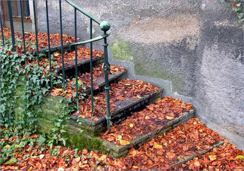 Du meine Güte. Was für ein schönes Bild... und dann so lange her - wie es miljas und Meer wohl gehen mag. Für mich ist die Antwort auf die Frage zum Bild: "Ja, da wohnt jemand, der das Laub auf den Stufen mehr liebt als eine ordentlich gekehrte Treppe." Bei uns war das früher mal so.