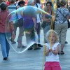 Ein Mädchen macht grosse Seifenblasen vor dem Kölner Dom