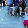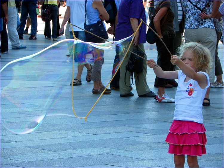 Sie macht grosse Seifenblasen vor dem Kölner Dom