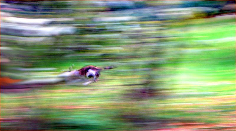 Plötzlich sprintete die Katze los. Das ging rasend schnell, deshalb habe ich die Kamera verzogen und das Foto ist misslungen. Das Eichhörnchen war glücklicherweise schneller und konnte entwischen.