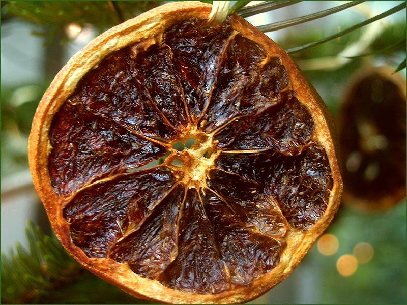 Eine Orangenscheibe am Tannenbaum als Christbaumschmuck.