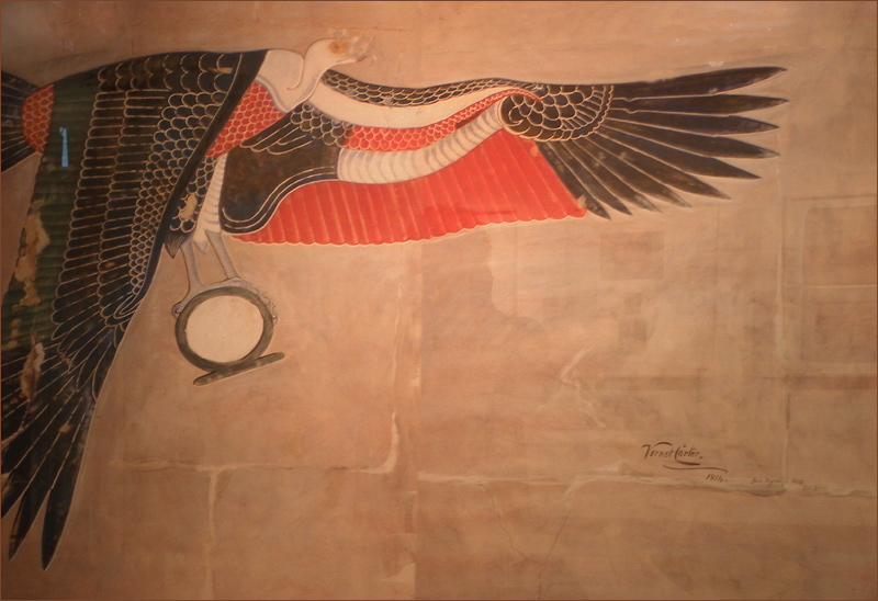 Ein Falke, in seinen Krallen hält er die Hieroglyphen für Leben und Unendlichkeit.