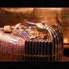 Aus dem grossen Sarkophag wurde in der Ausstellung dieser mittlere Sarkophag herausgenommen und danebengestellt. In ihm befindet sich der unterste Sarkophag mit der Mumie von Tutanchamun.