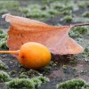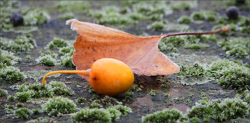 Ginkgofrucht und ein Ginkgoblatt