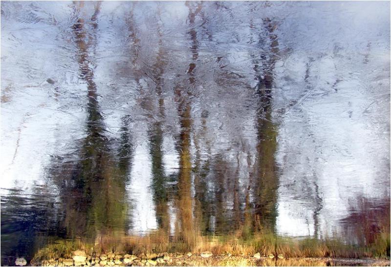 Dieses Bild ist eine kleine Eulenspiegelei, denn um 180 Grad gedreht ist es horizontal gespiegelt ein heute morgen bei 6 Grad Minustemperatur fotografierter zufrierender Teich.