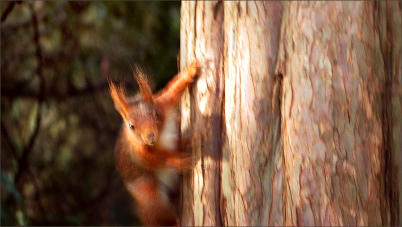 Ist das das Eichhörnchen aus deinem Eichhörnchenvidieo das sich in den Schutz der Eibe flüchtet, um von da aus zu schauen ob dieses Objektiv Gefahr bedeutet? Es schaut etwas erschreckt und doch neugierig vom Eibenstamm herunter.