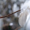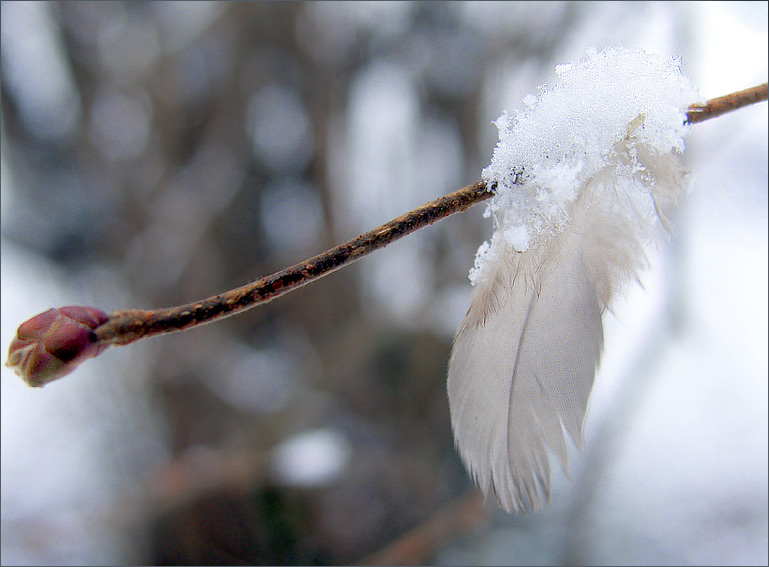 Die Feder ist an diesem Zweig hängengeblieben...und die Schneeflocken sind an ihr hängengeblieben.